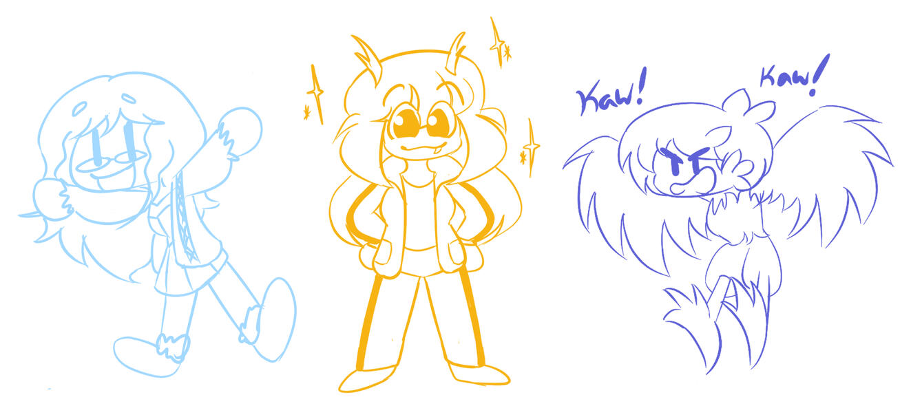 A doodle page consisting of one full body drawing, one half body drawing, and one headshot drawing!